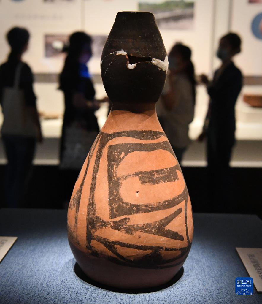这是9月4日在“繁星盈天——中国百年百大考古发现展”上拍摄的“几何鱼纹彩陶葫芦瓶”。