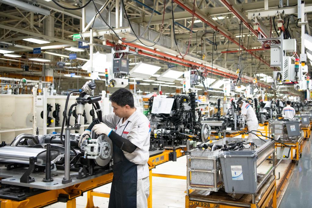 9月3日,工人在神龙汽车有限公司成都分公司总装车间内装配汽车零部件。新华社记者 胥冰洁 摄