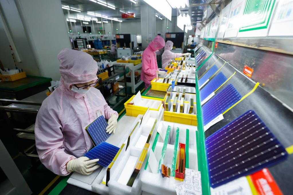 9月3日,在实施闭环生产的通威太阳能(成都)有限公司厂房内,工人在检查单晶硅太阳能电池片成品质量。新华社记者 沈伯韩 摄