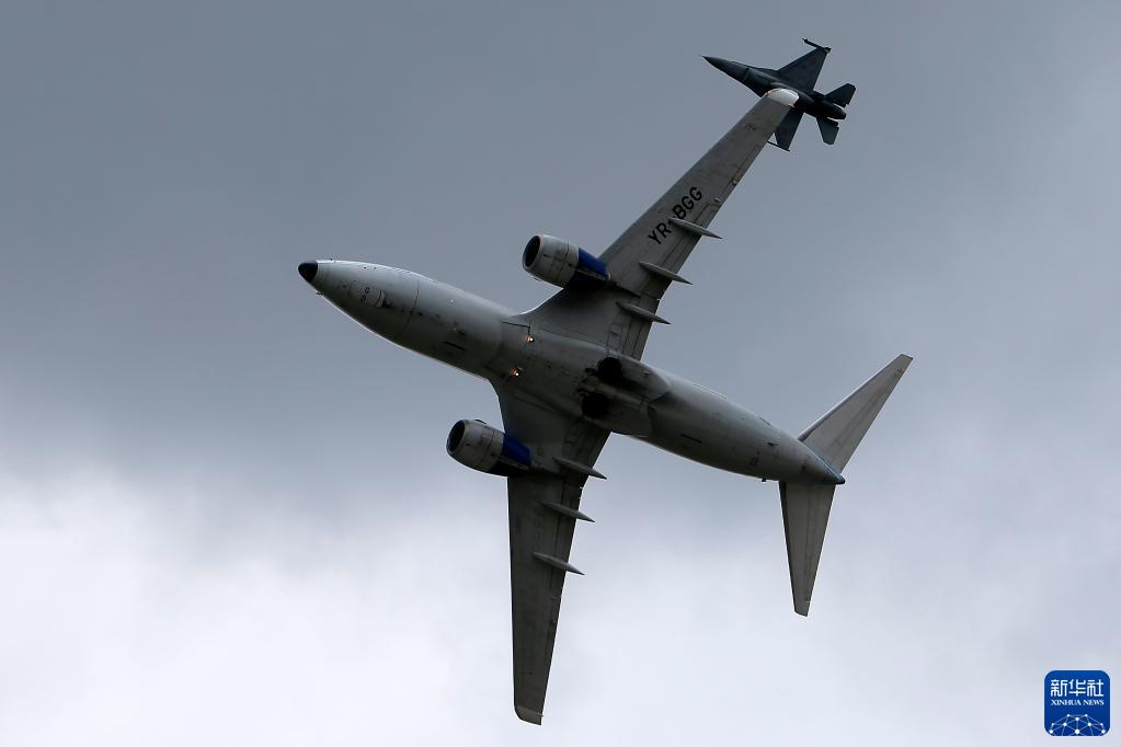 9月4日,在罗马尼亚布加勒斯特,罗马尼亚空军战斗机(上)表演为民用航班护航。