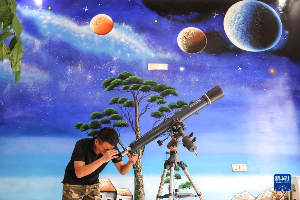 2022年7月19日,32岁的刘成亮在民宿内调试望远镜。2016年,刘成亮搬离天眼核心区迁至航龙村星际家园,并将安置房用于经营民宿。目前,刘成亮所经营的民宿有14个房间,在每年的旅游旺季,入住率能达到百分之八十以上。