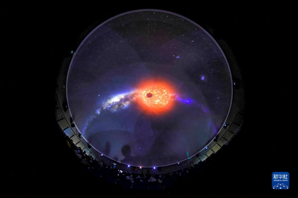 2022年7月20日,参观者在天文体验馆内观看天文科普电影。