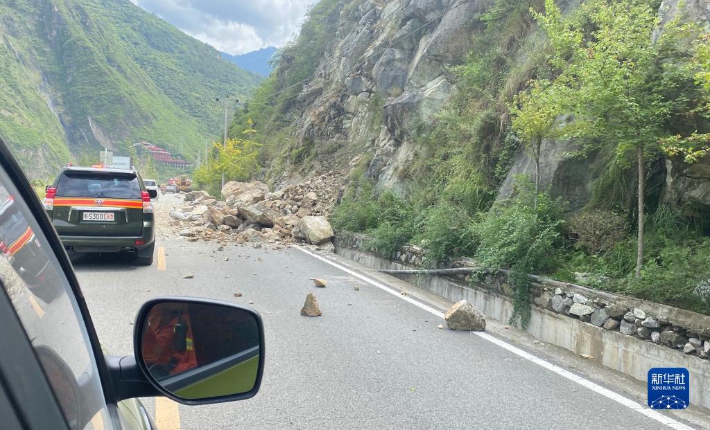 山石掉落在四川省甘孜州泸定县冷碛镇附近的道路上(9月5日摄)。据中国地震台网正式测定,9月5日12时52分四川甘孜州泸定县发生6.8级地震,震源深度16千米。 新华社发
