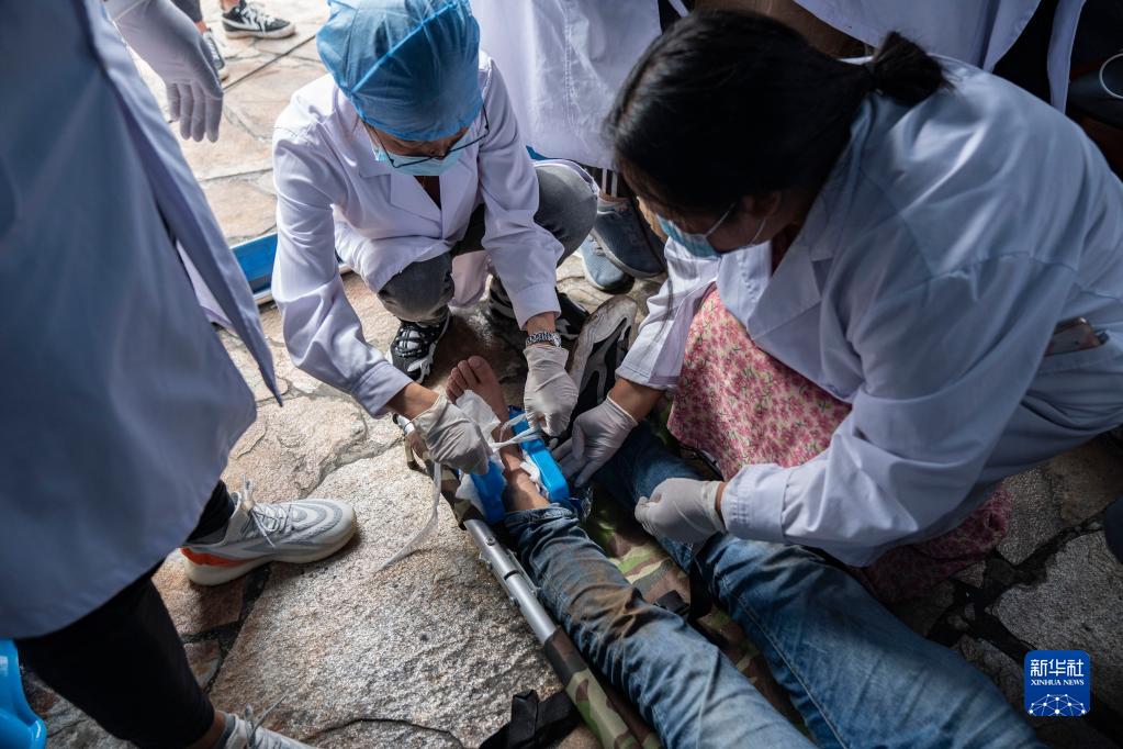 9月6日,在四川甘孜州泸定县磨西镇海螺沟广场受灾群众临时安置点,医护人员为伤员包扎。新华社记者 才扬 摄
