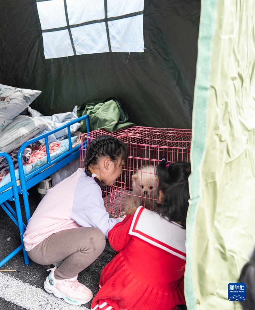 9月6日,在四川甘孜州泸定县磨西镇海螺沟广场受灾群众临时安置点,儿童与从家中带过来的小狗玩耍。新华社记者 才扬 摄