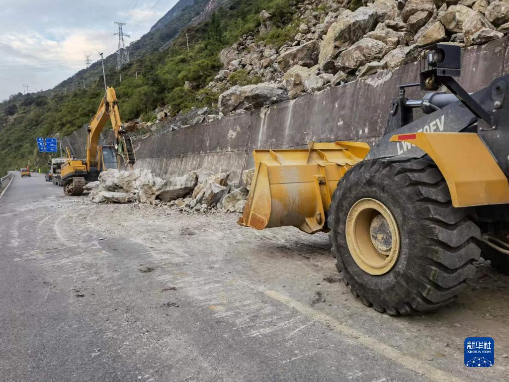 9月6日上午,工程机械在省道S217线泸石路快速通道K30二里坝段进行抢通作业。新华社发