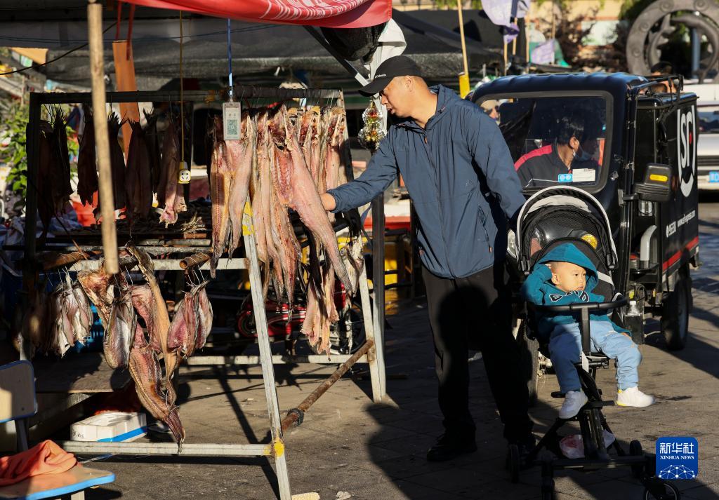 9月4日,一名市民带着孩子在抚远市东极鱼市选购。