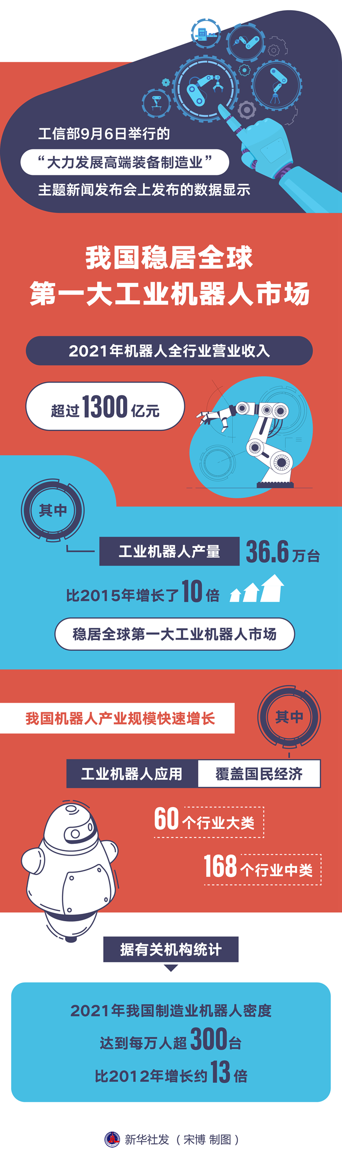 新华社北京9月6日电(记者张辛欣)工信部装备工业一司副司长郭守刚6日表示,我国机器人产业规模快速增长,2021年机器人全行业营业收入超过1300亿元。其中,工业机器人产量达36.6万台,比2015年增长了10倍,稳居全球第一大工业机器人市场。