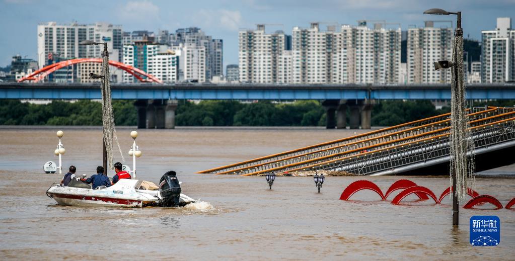 9月6日,在韩国首尔,工作人员乘快艇查看被水淹的汉江公园。新华社/纽西斯通讯社