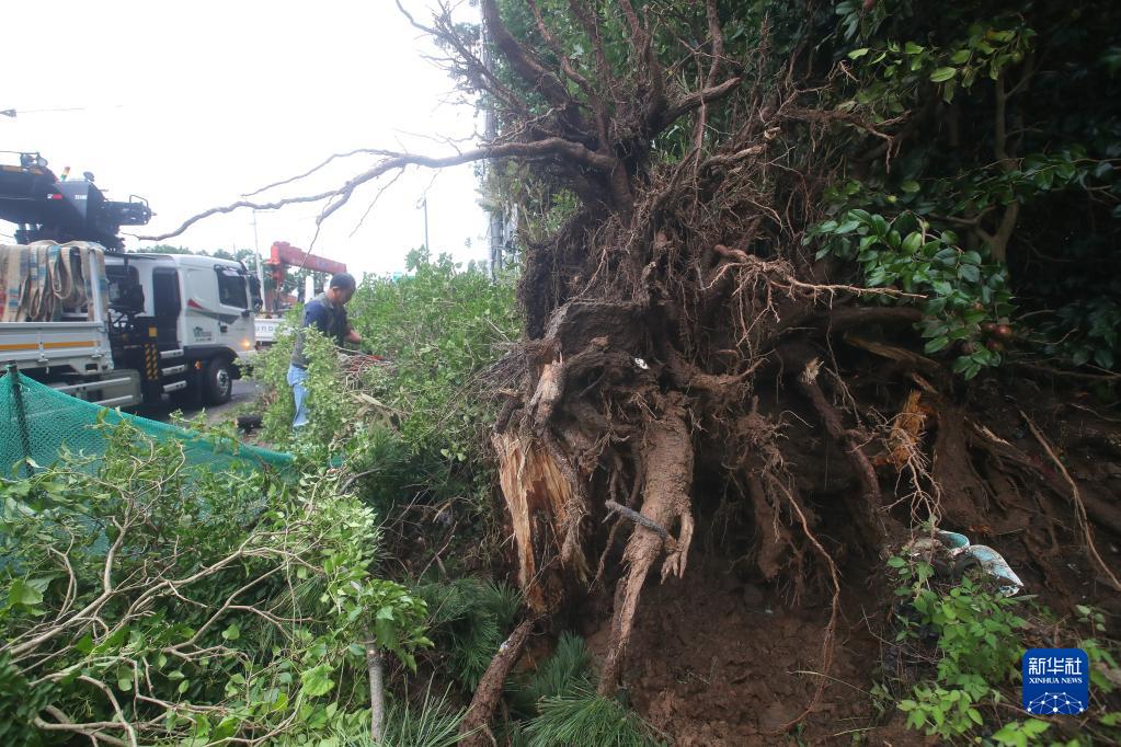 9月6日,在韩国济州市,一棵大树在台风中倾倒。新华社/纽西斯通讯社