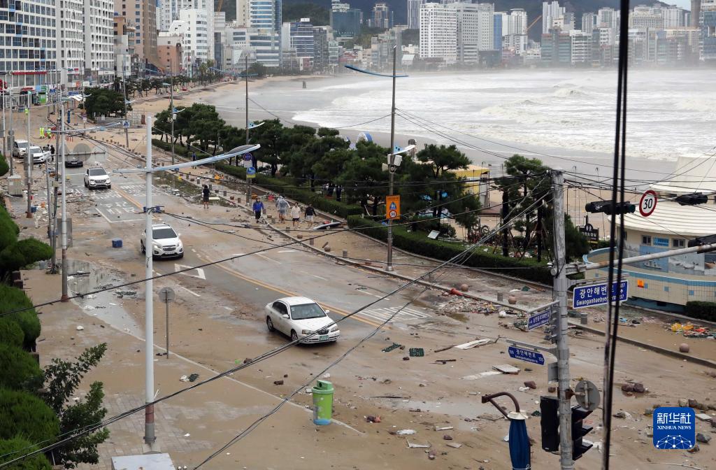 这是9月6日在韩国釜山拍摄的在台风中受损的道路。新华社/纽西斯通讯社