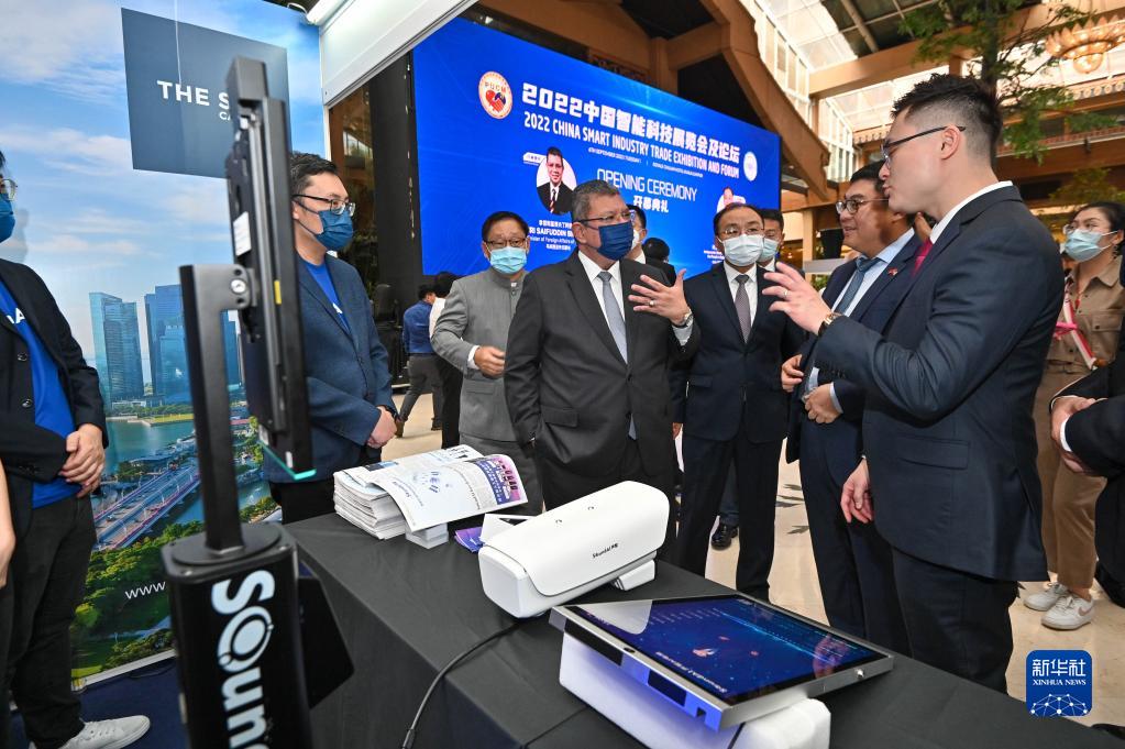 9月6日,在马来西亚吉隆坡,马来西亚外长赛夫丁(前左二)在2022中国智能科技展览会及论坛上参观。新华社发(张纹综摄)
