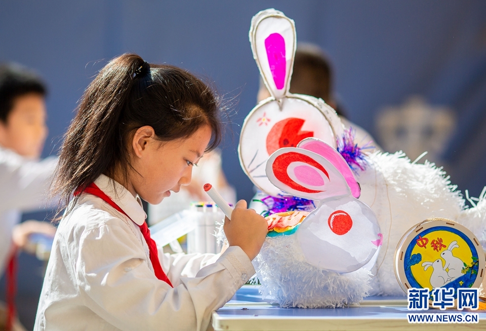 9月7日,呼和浩特市玉泉区恒昌店巷小学学生在绘制玉兔花灯。新华网 发(丁根厚 摄)