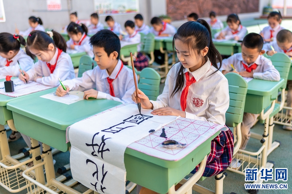 9月7日,呼和浩特市玉泉区恒昌店巷小学学生在书写中秋诗词佳句。新华网 发(丁根厚 摄)