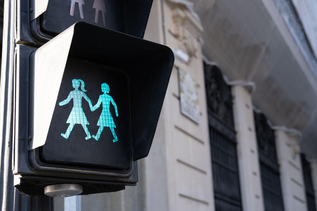 这是2021年3月6日在西班牙马德里街头拍摄的行人信号灯。西班牙马德里2017年耗资22000欧元,在72处路口更换了288个行人信号灯。其中有穿裙装、手牵手等不同的形象,用以号召性别平等。新华社记者孟鼎博 摄