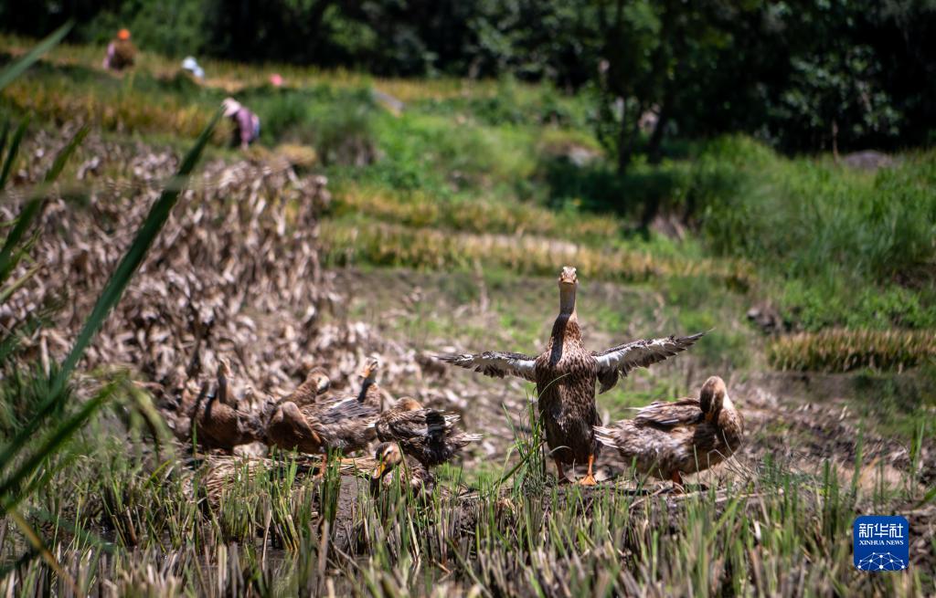 鸭子在收获后的稻田里嬉戏(9月7日摄)。
