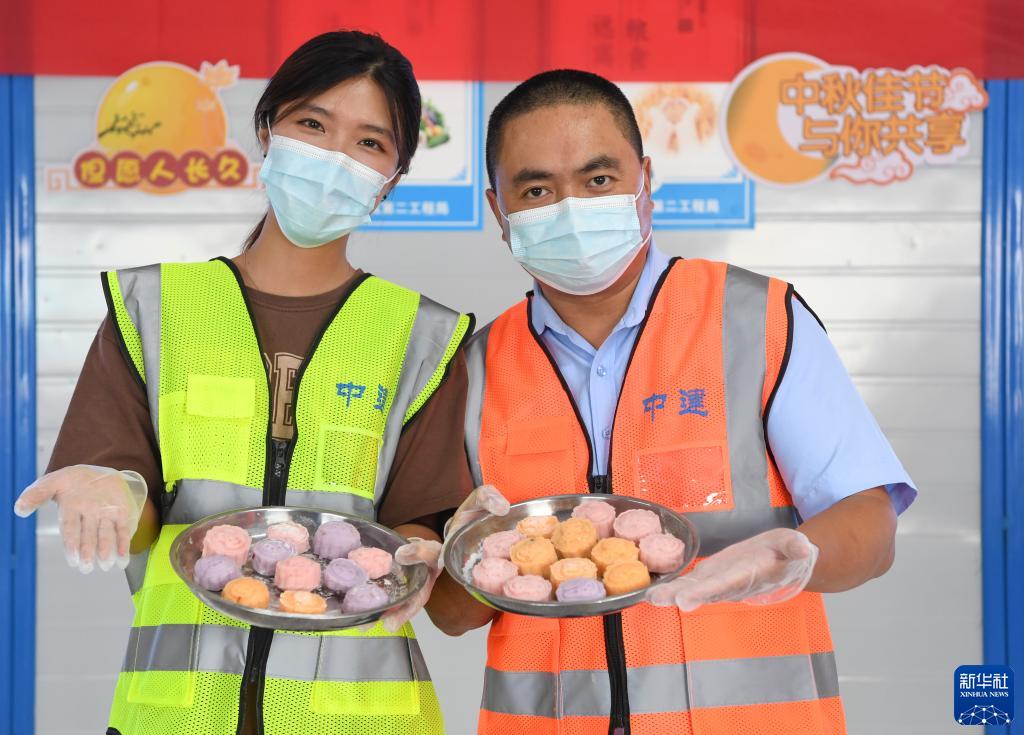 9月7日,工友在中建二局招商西永项目部展示手工制作的月饼。