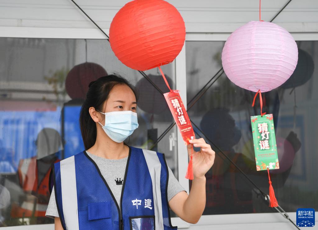 9月7日,工友在中建二局招商西永项目部参与猜灯谜活动。