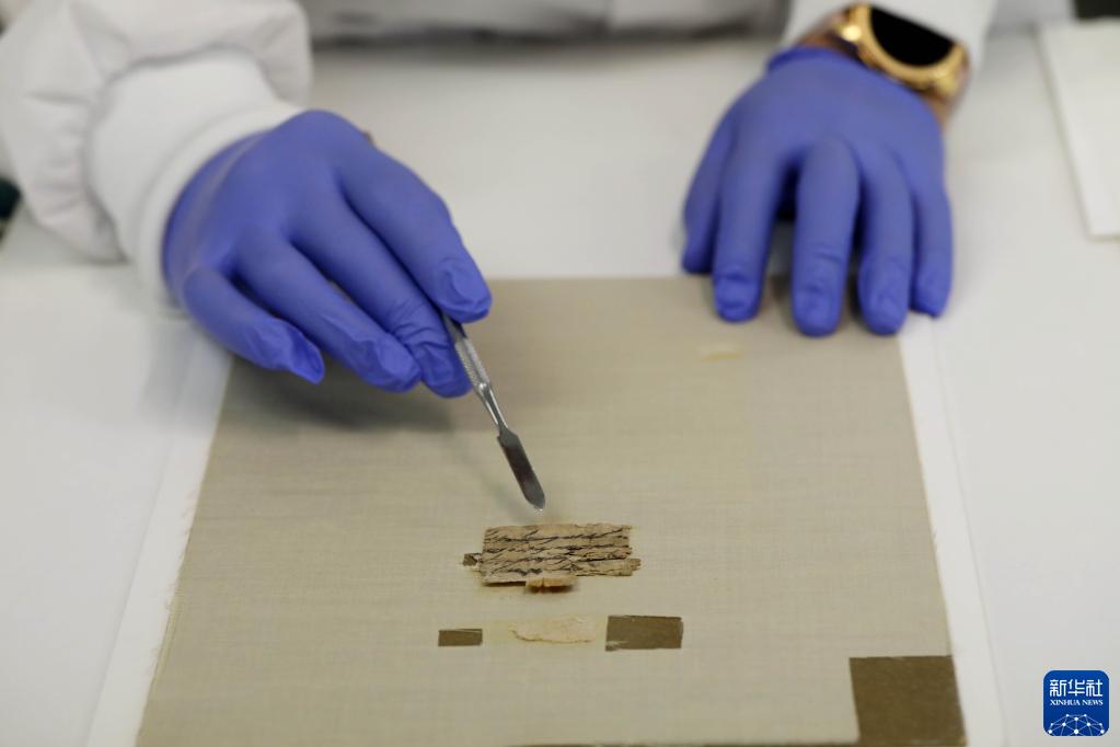 9月7日,在耶路撒冷,研究人员展示记录古希伯来语信息的莎草纸信件碎片。