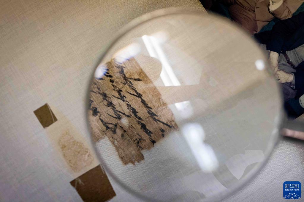 这是9月7日在耶路撒冷拍摄的记录古希伯来语信息的莎草纸信件碎片。