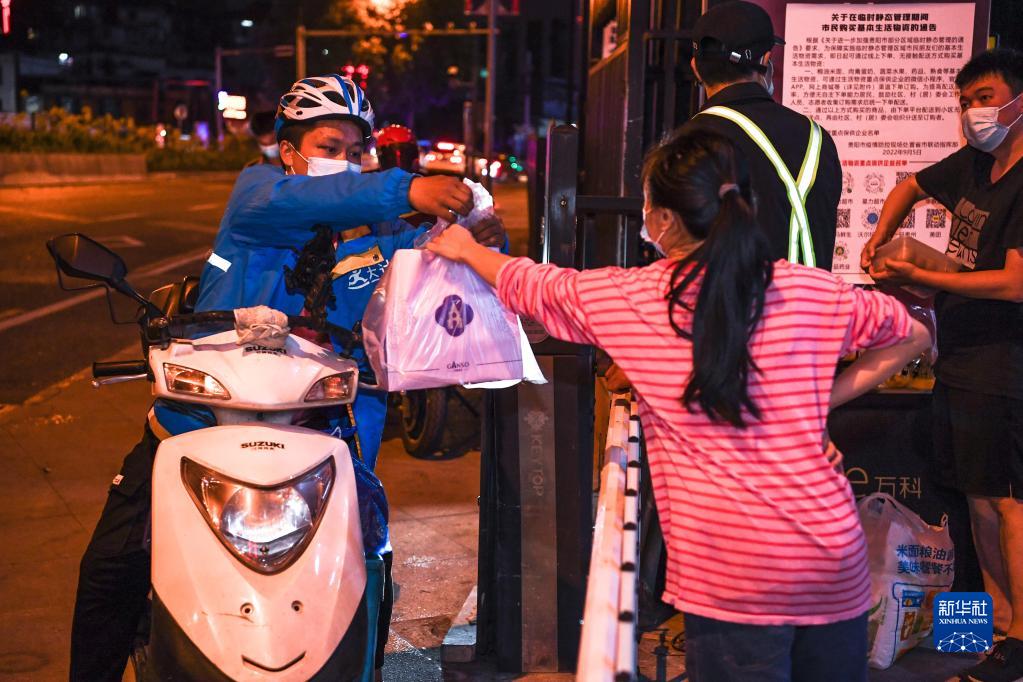 9月7日夜,快递员在贵阳市云岩区给市民配送生活物资。