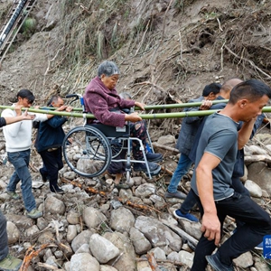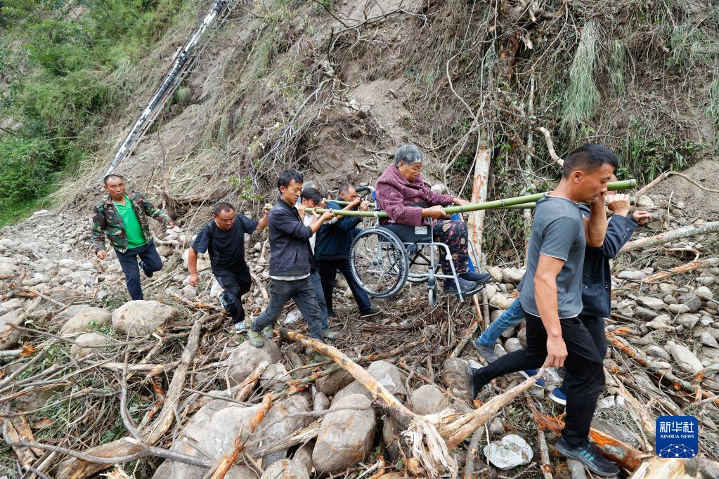 9月8日,在四川省甘孜州泸定县磨西镇附近,人们将一位从磨子沟村疏散出来的受伤人员抬出。新华社记者 沈伯韩 摄