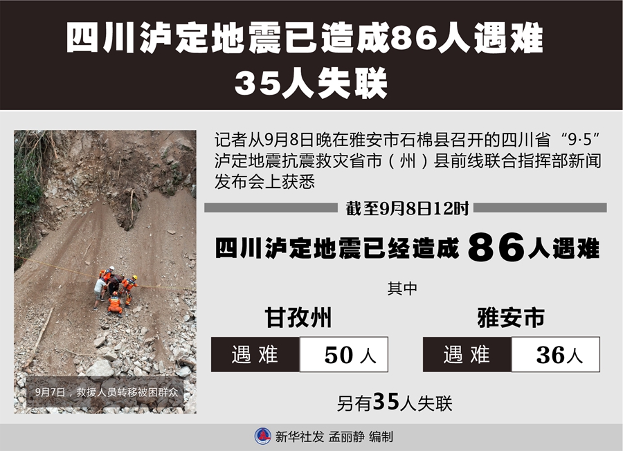 新华社成都9月8日电 记者从8日晚在雅安市石棉县召开的四川省“9·5”泸定地震抗震救灾省市(州)县前线联合指挥部新闻发布会上获悉,截至8日12时,四川泸定地震已经造成86人遇难,其中甘孜州50人遇难、雅安市36人遇难,另有35人失联。
