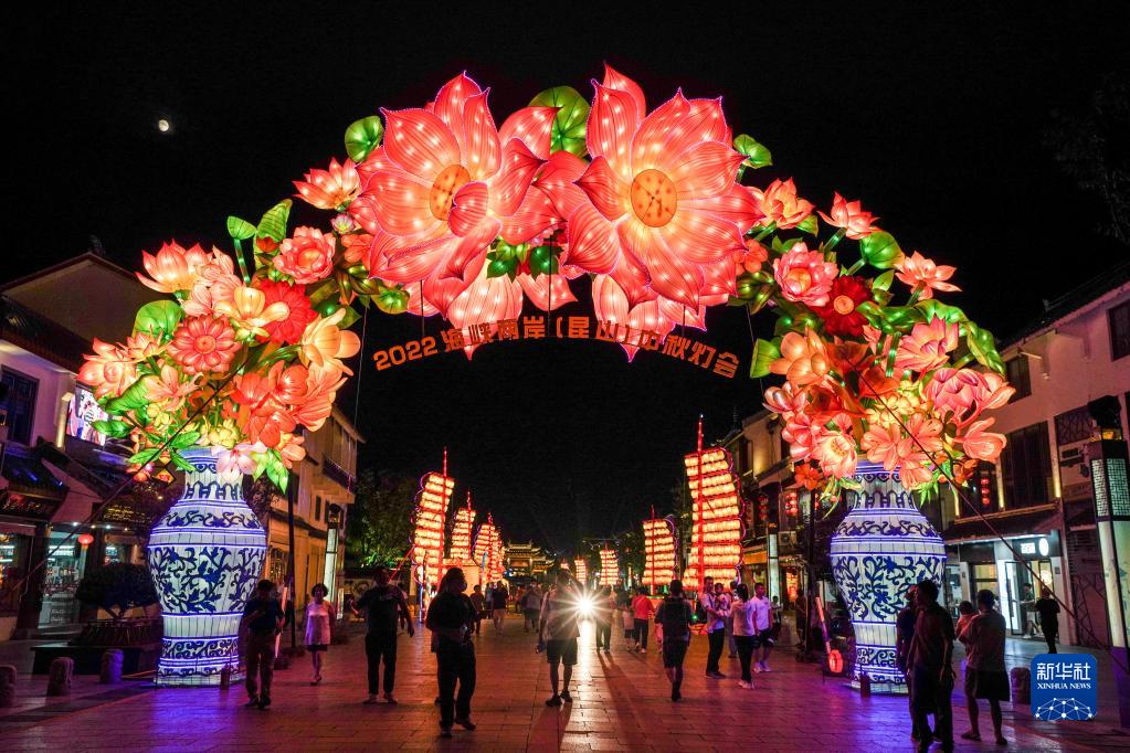 9月8日,2022海峡两岸(昆山)中秋灯会在江苏省昆山市周庄古镇举行亮灯仪式,本届灯会以“花开并蒂 灯映两岸”为主题,即日起至10月7日在周庄、锦溪等四个灯区展出。新华社记者 杨磊 摄