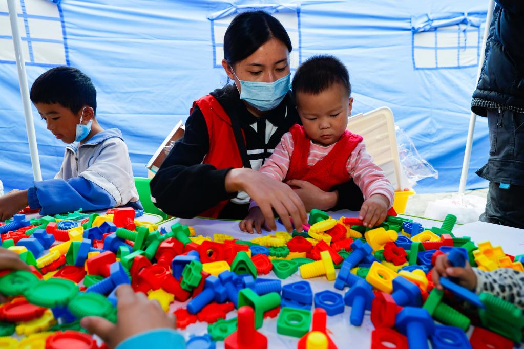 9月7日,在四川省甘孜州泸定县磨西镇地震救灾安置点,志愿者陪伴孩子们在青青儿童乐园玩玩具。新华社记者 沈伯韩 摄