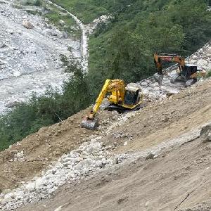 9月7日,在四川省甘孜州泸定县磨西镇附近,四川路桥的工作人员在抢修通往海螺沟景区的道路。新华社发