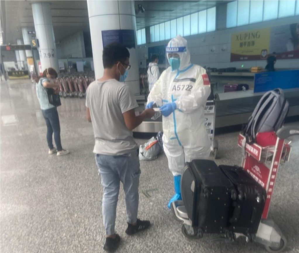 在崔世昌的防护服上,有一个显眼的红色心形贴纸,这是他自己设计制作的国际行李查询标志,方便旅客在人群中能够快速找到他们。