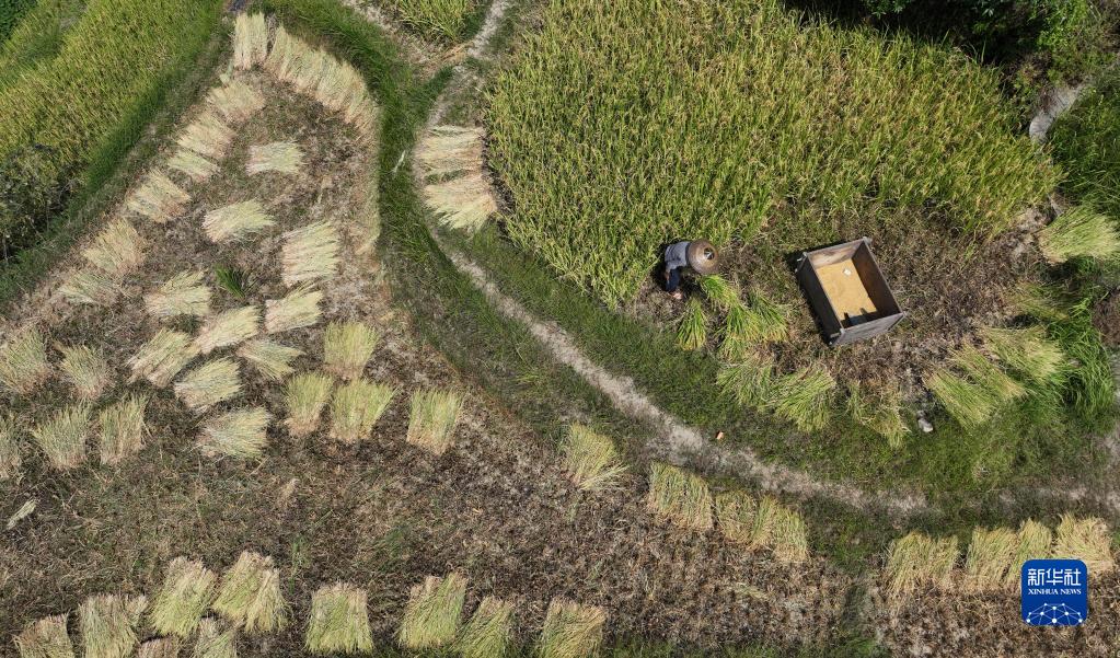 在中国农民丰收节即将到来之际,“世界灌溉工程遗产”“全球重要农业文化遗产”湖南省娄底市新化县水车镇紫鹊界梯田种植的水稻陆续进入成熟期,田野一片金黄,农民利用晴好天气抢收抢割。