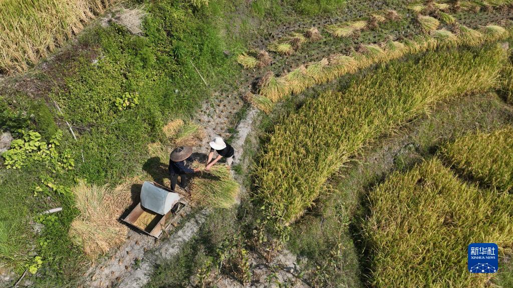 在中国农民丰收节即将到来之际,“世界灌溉工程遗产”“全球重要农业文化遗产”湖南省娄底市新化县水车镇紫鹊界梯田种植的水稻陆续进入成熟期,田野一片金黄,农民利用晴好天气抢收抢割。
