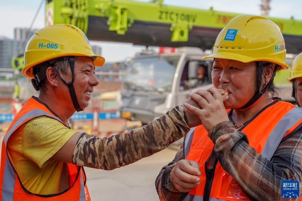 9月8日,来自河南濮阳的贾庆全、张自忍(右)夫妇在济南浪潮智能计算产业园建设项目现场品尝月饼。
