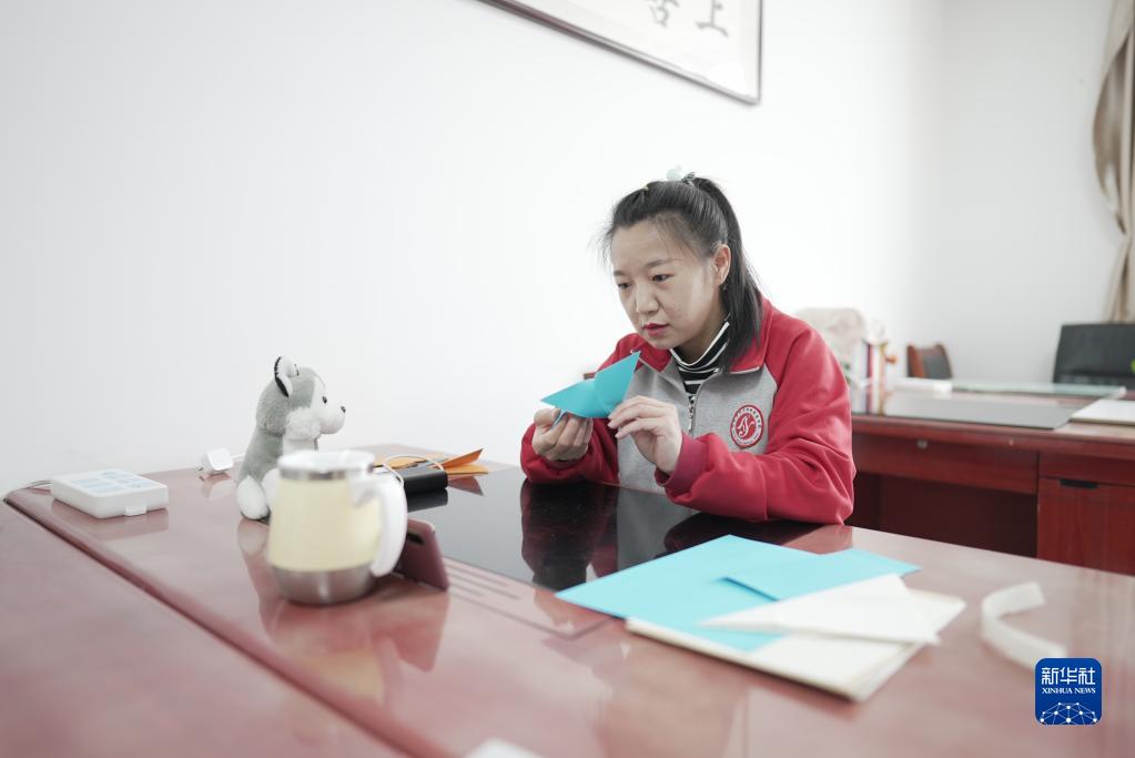 王雅妮在内蒙古呼和浩特市特殊教育学校的办公室里给学生们上网课(2022年4月28日摄)。新华社记者 达日罕 摄