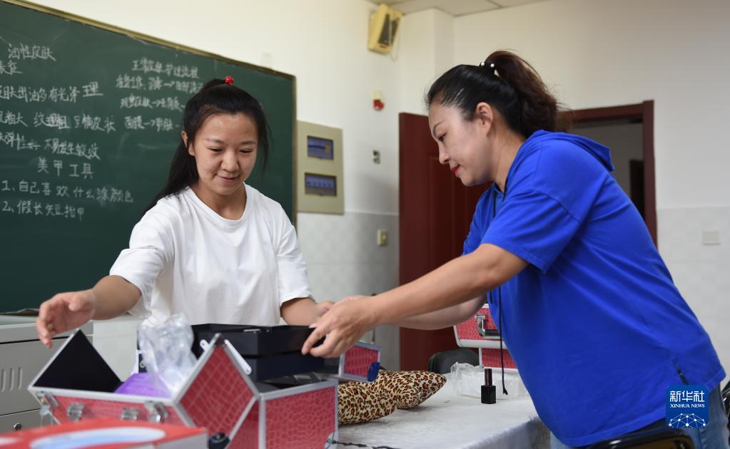 内蒙古呼和浩特市特殊教育学校的王旭荣老师(右)帮助王雅妮整理教具(2022年8月8日摄)。新华社记者 连振 摄