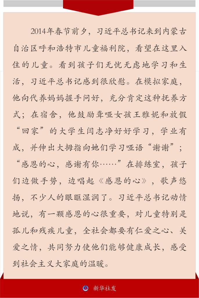 2014年春节前夕,习近平总书记来到内蒙古自治区呼和浩特市儿童福利院,看望在这里入住的儿童。看到孩子们无忧无虑地学习和生活,习近平总书记感到很欣慰。在模拟家庭,他向代养妈妈握手问好,充分肯定这种抚养方式;在宿舍,他鼓励聋哑女孩王雅妮和放假“回家”的大学生闫志净好好学习,学业有成,并伸出大拇指向她们学习哑语“谢谢”;“感恩的心,感谢有你……”在排练室,孩子们边做手势,边唱起《感恩的心》,歌声悠扬,不少人的眼眶湿润了。习近平总书记动情地说,有一颗感恩的心很重要,对儿童特别是孤儿和残疾儿童,全社会都要有仁爱之心、关爱之情,共同努力使他们能够健康成长,感受到社会主义大家庭的温暖。