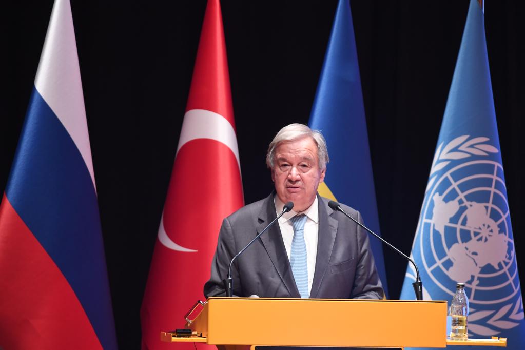 8月20日,在位于土耳其伊斯坦布尔的土耳其国防大学内的黑海粮食外运联合协调中心,联合国秘书长古特雷斯出席新闻发布会。新华社记者沙达提摄