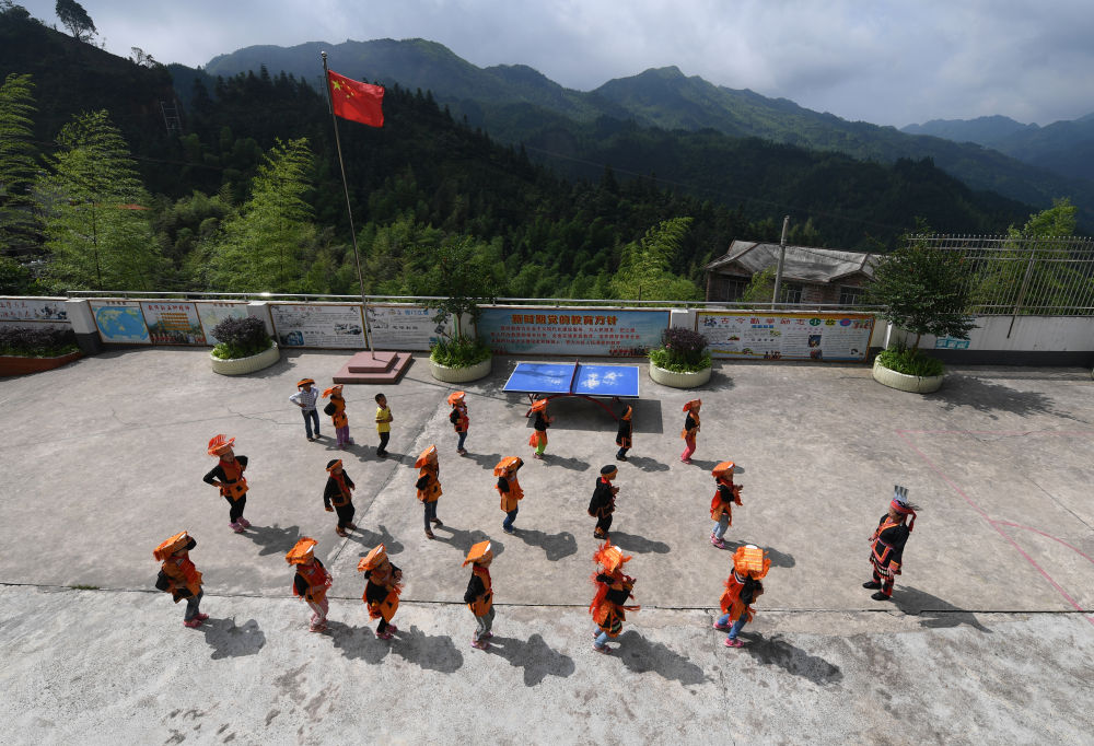 登晒小学师生在课间一起做游戏(2019年3月12日摄)。登晒小学地处黔桂边界,同属贵州省黎平县龙额镇和广西壮族自治区三江侗族自治县富禄苗族乡,是黔桂共建的一个教学点,师生有的来自贵州,有的来自广西,有“一校跨两省区、两省区辖一校”之称。