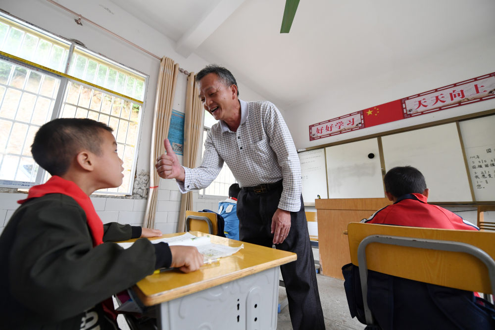 在广西昭平县五将镇良风村小学冲尾教学点,龚寿新老师在课堂上表扬一名学生(2020年5月25日摄)。龚寿新从事教育工作后,一直在这所教学点工作,至今已连续坚守这里41年。
