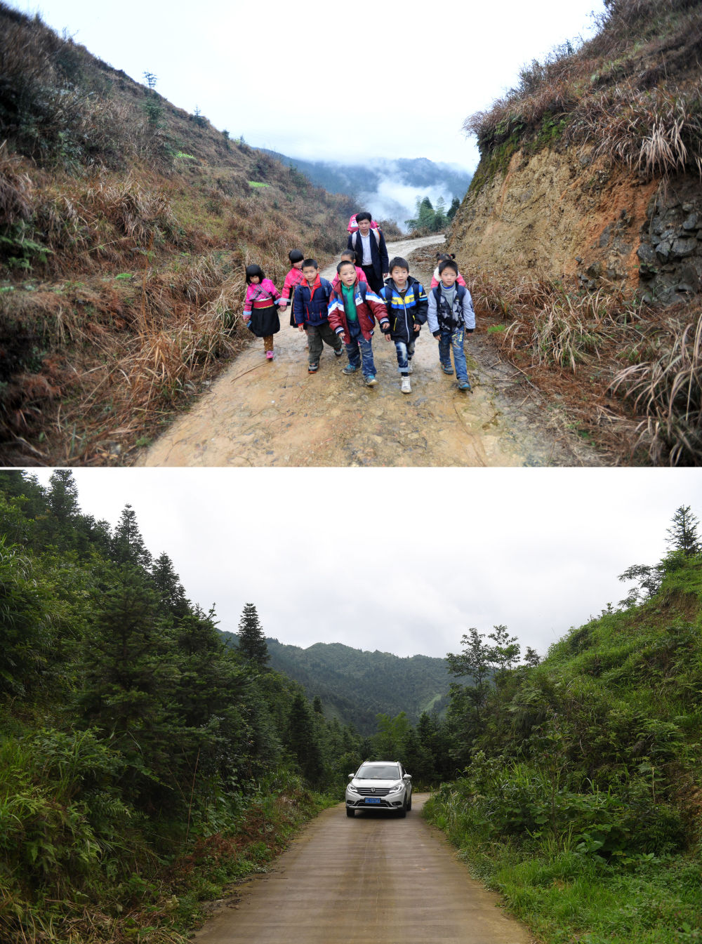 上图:在广西龙胜龙脊镇江柳村,余启贵老师背着背篓领着学生去学校(2013年2月26日摄);下图:在广西龙胜龙脊镇江柳村,余启贵老师开着自己的汽车带着学生去学校(2020年7月7日摄)。