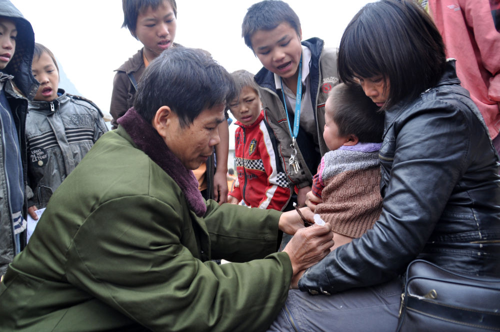 在广西大化瑶族自治县大化镇龙马村龙万移民新村教学点,班爱花老师抱着一个发烧的小孩让医生打针治疗(2012年1月11日摄)。