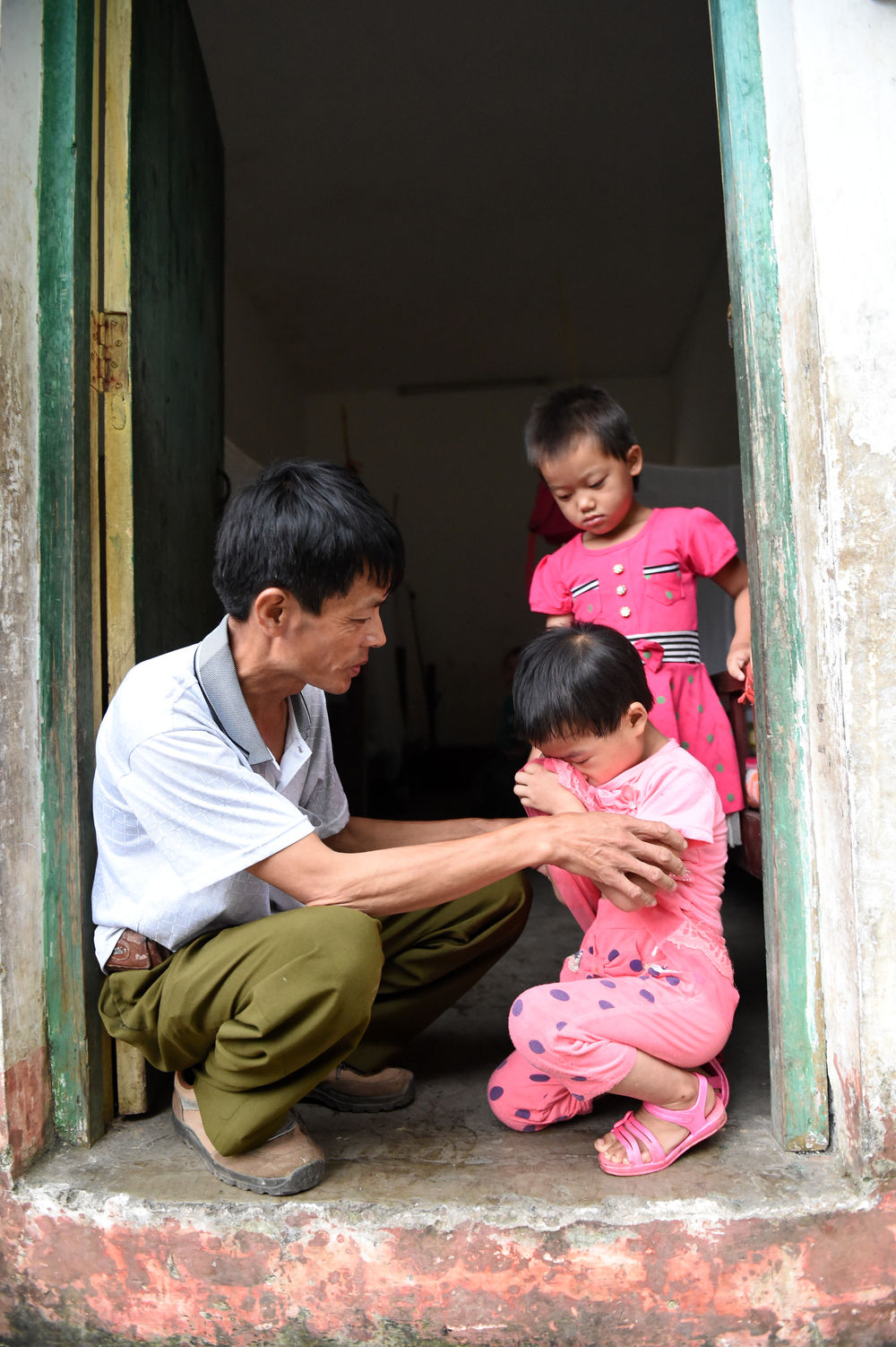 在广西东兰县三石镇泗爷小学,学校唯一的老师黄英雄在安慰一个因想家而哭泣的寄宿生(2014年9月10日摄)。