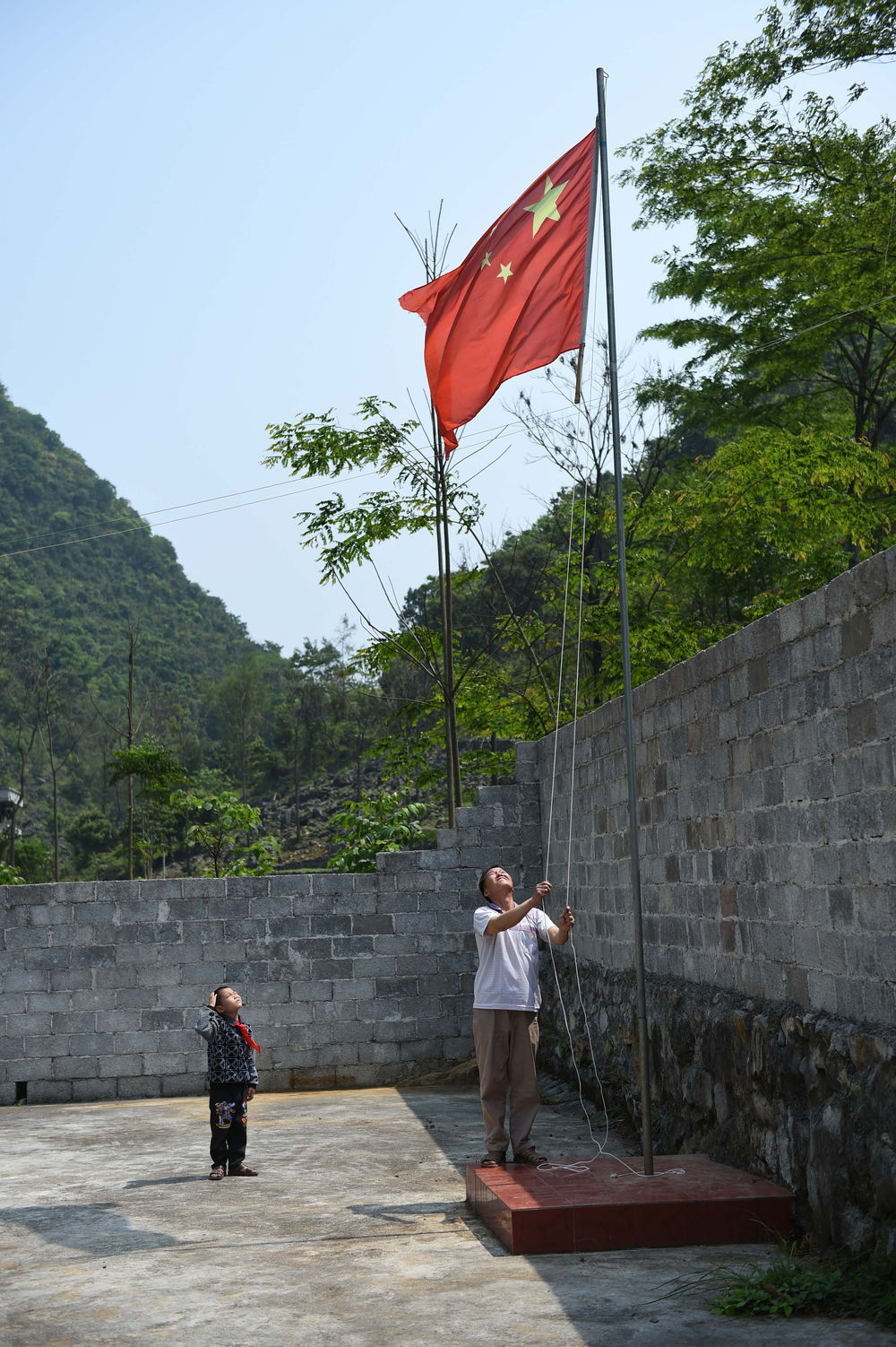 在广西都安瑶族自治县菁盛乡义德小学弄豆教学点,蓝启飞老师和学生蓝孟源在升国旗(2015年4月15日摄)。蓝启飞是这所教学点唯一的老师,蓝孟源是这所教学点唯一的学生。