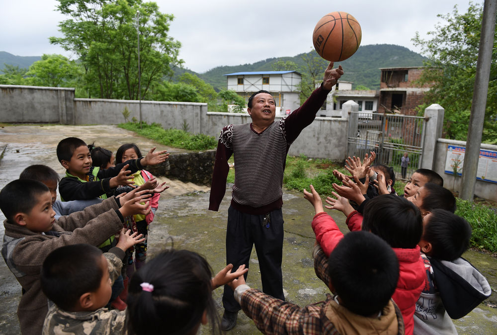 在广西全州县白宝乡北山村小学,右手残疾的唐广芳老师在给学生上体育课(2016年4月26日摄)。