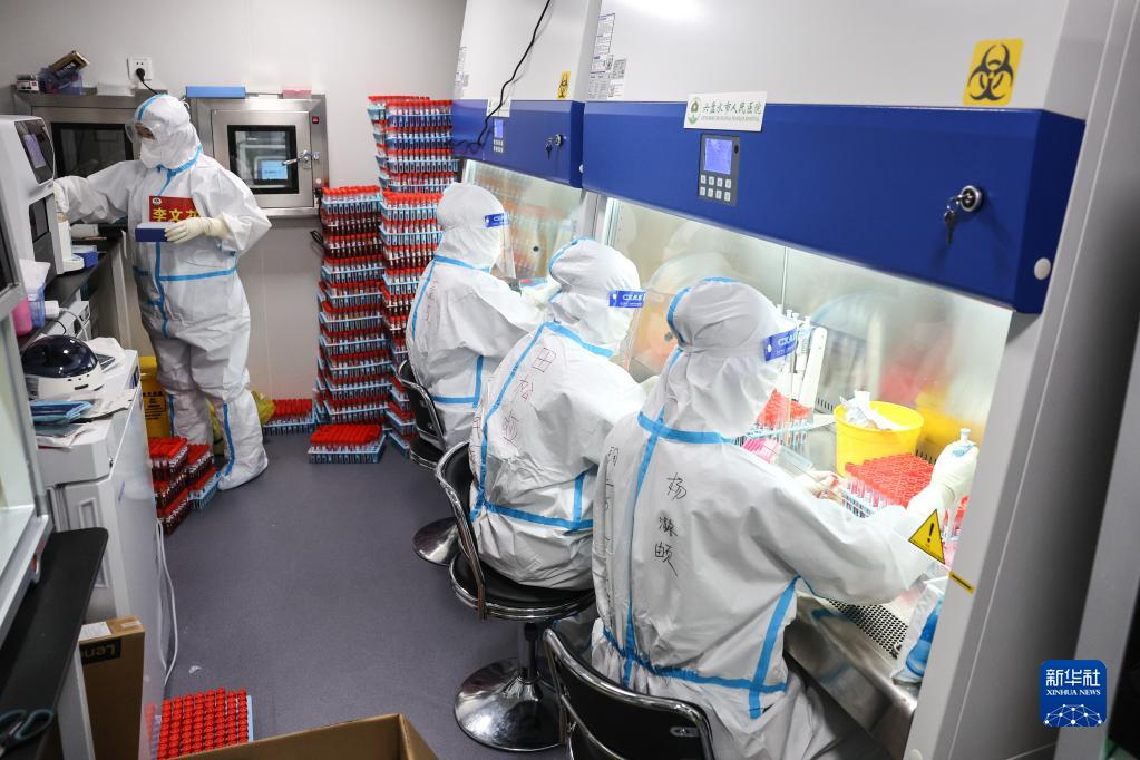 贵阳市筑城广场移动方舱核酸检测基地是承担贵阳市大规模核酸检测任务的“主阵地”之一。为尽快完成核酸检测工作,实验室检测团队采取24小时轮班倒制度,昼夜兼程。新华社记者 欧东衢 摄
