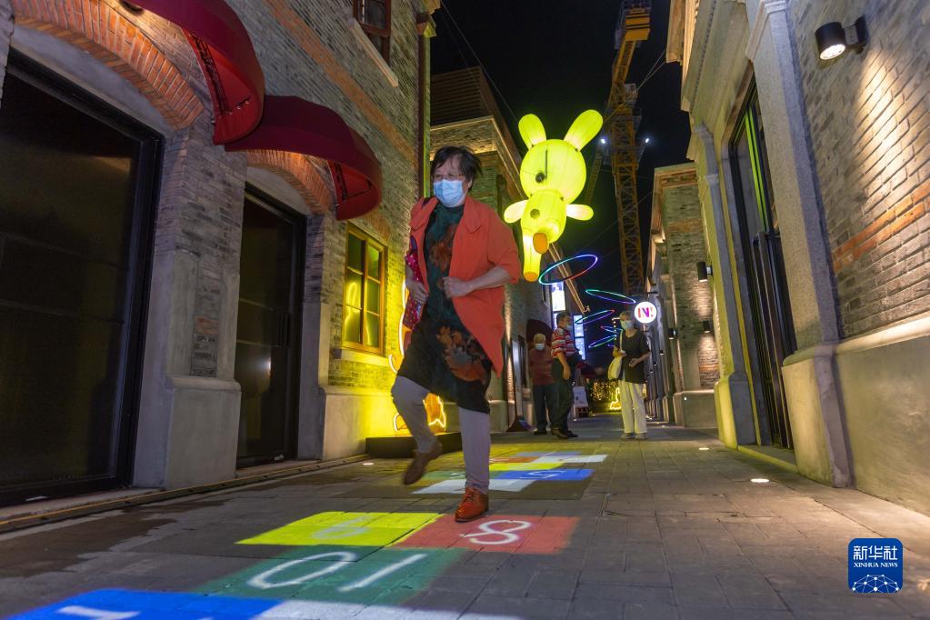 9月9日,市民在“今潮8弄”中秋灯会体验跳房子游戏。