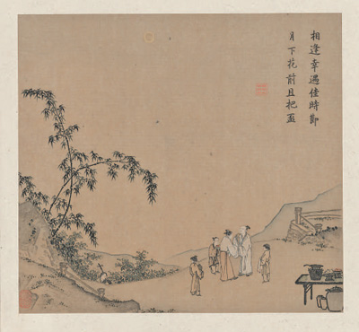 画面右上方题写的诗句是:“相逢幸遇佳时节,月下花前且把杯”。“佳时节”是“良辰”,“月下花前”是“美景”,加之朋友“相逢”,相对“把杯”,心情怎能不舒畅、不快乐呢?一联诗14个字,良辰、美景、赏心、乐事均全,却又流畅自然,真可谓措辞精妙。