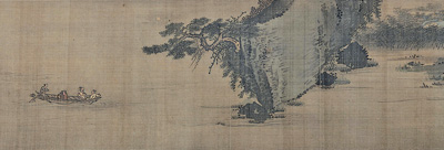 上海博物馆藏有一件元代张远的《潇湘八景图》卷,它灵活地调整八景的顺序,再利用沙渚、水面、远山等自然过渡,将八景绾合在一起,布置了一片连绵的山水长卷。“洞庭秋月”在画面的后段,前接“烟寺晚钟”,后连“江天暮雪”。它以渔舟停泊的坡岸“起兴”,忽而拔起一块高峻的绝壁,但并不占用太多篇幅,随即由倒垂的古松引出一片朦胧的月色:圆月在纤云间浮动,月光投射在平阔的水面;赏月的游人乘舟缓行,促膝轻谈,身后摆设着食盒与酒瓮;载酒的小舟紧随其后,划出几条清浅的波纹。
