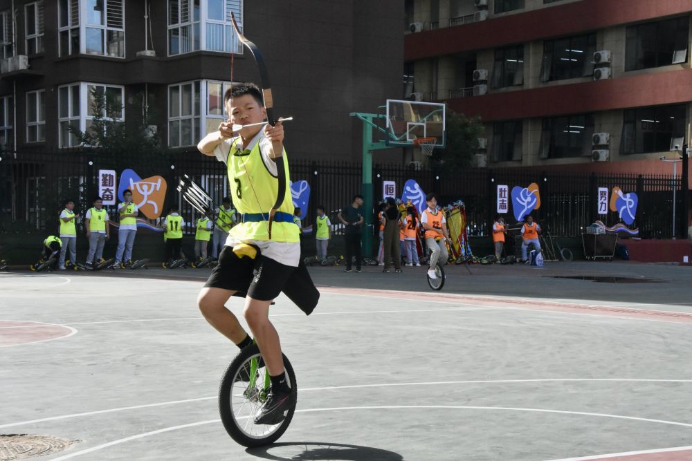 (学生练习独轮车骑射)